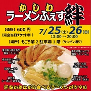 柏市内外の人気ラーメン店が大集結 ・東池袋大勝軒系列 麺屋「こうじ」 ・横浜家系ラーメン 「宗八」 ・和風ラーメン 「夢館」 ・鶏白湯 らーめん「武士道」 ・濃厚和風とんこつ 麺屋「てっぺん」 ・元祖バカ豚 山勝「角ふじ」 ・濃厚とんこつ 横浜家系「誠家」